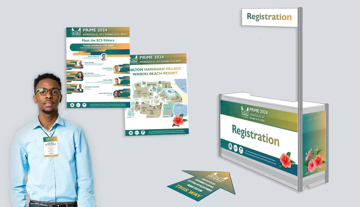 Promotional materials for conferences, including signage, posters, booth materials, badges etc.